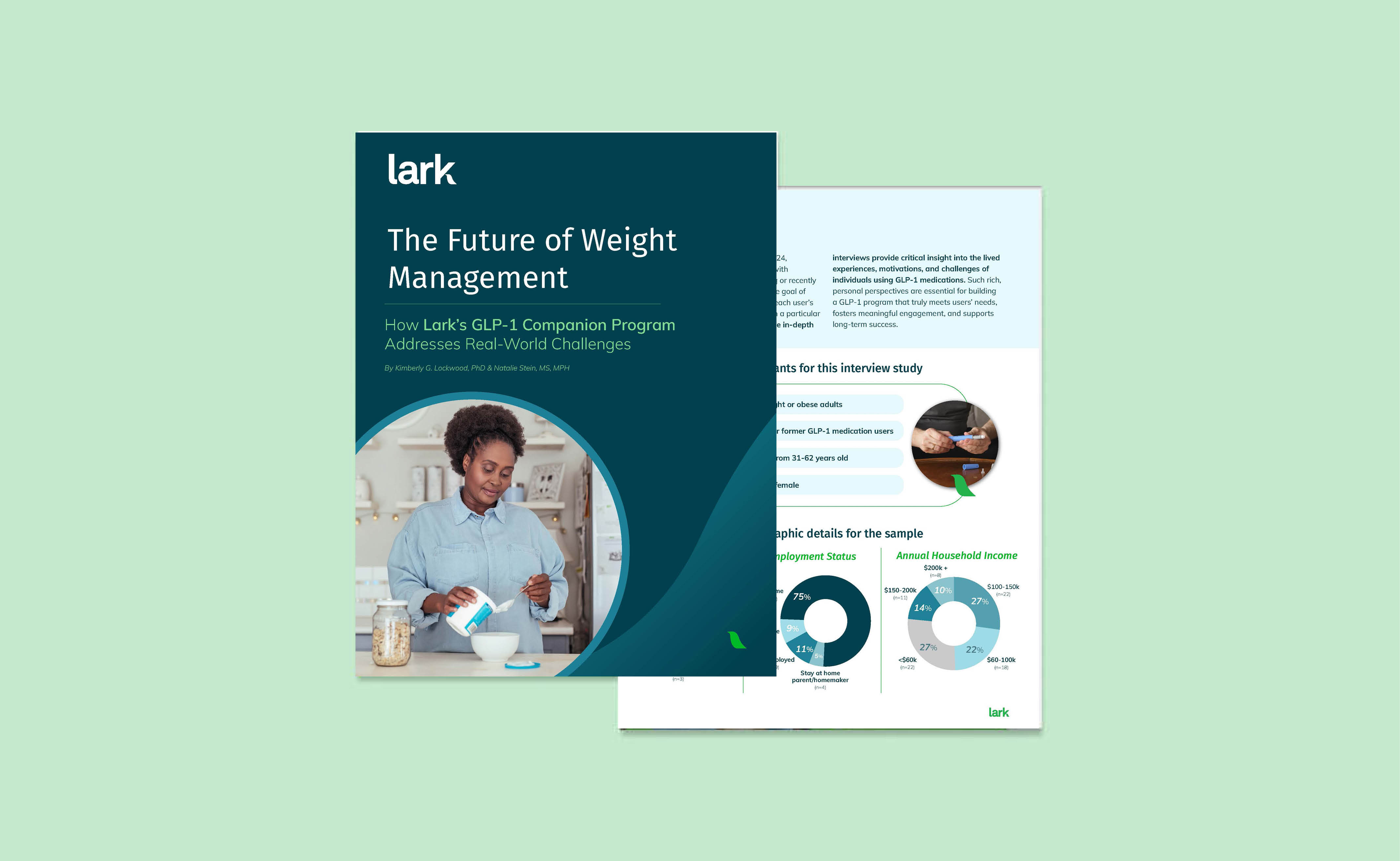 Since GLP-1s are not right for everyone and require comprehensive support for lasting success, Lark’s unique approach to GLP-1 management includes a tailored combination of responsible clinical screening and prescribing, ongoing clinical management, and industry-leading behavior change coaching that’s available 24/7. As part of this approach, Lark will now offer three new programs – the Healthy Weight program, GLP-1 Companion program, and Clinician-Guided Step Therapy program – all of which leverage the sustained behavior change, lifestyle management, and remote patient monitoring Lark is known for.